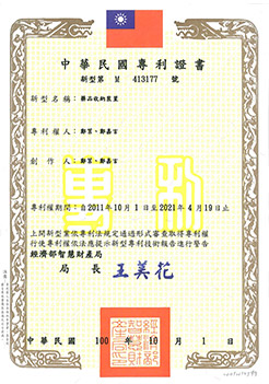 藥品收納裝置專利,新型專利發明第M413177號。